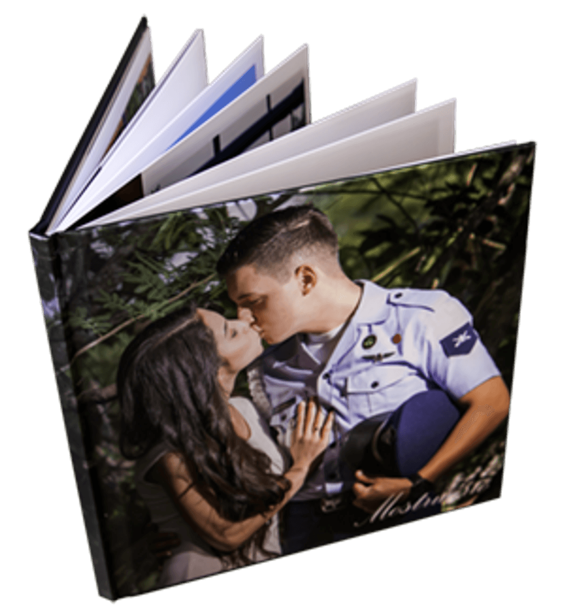 Álbum da linha luxo, diagramado, encadernado e panorâmico. Além disso vem com capa dura impressa e laminada em fosco ou brilho ou impresso em papel especial, silk.